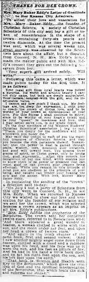 None of the allusions to Mrs. Eddy, used in this Journal article, hold even a scintilla of fact. Mrs. Eddy’s mother and family all told her that as a child she possessed the disposition of an angel. Also, her joy and love were sadly missed when she left the family home. At the age of eight she heard God’s voice speaking her name many, many times. Because of her spirituality, she was a natural healer, even as a child. As a young person, she was a constant and close student of her Bible and unfailingly faithful to God. It was noted by those who knew her that there was never a comment or word uttered against the good name of Miss Baker. From the age of twenty-three she longed for the answer to the mental cause and cure of disease and desired to find this truth for the sake of mankind. A large portion of her life was lived in constant pain, semi-invalidism and total debilitation. But none of this kept her from her love and purity. Our Leader went through periods of semi-starvation, constant bodily pain, through such severe lack that she did not have money enough for the bare essentials of life, and the few clothes she had were threadbare. Job could not have withstood the trials of this woman.